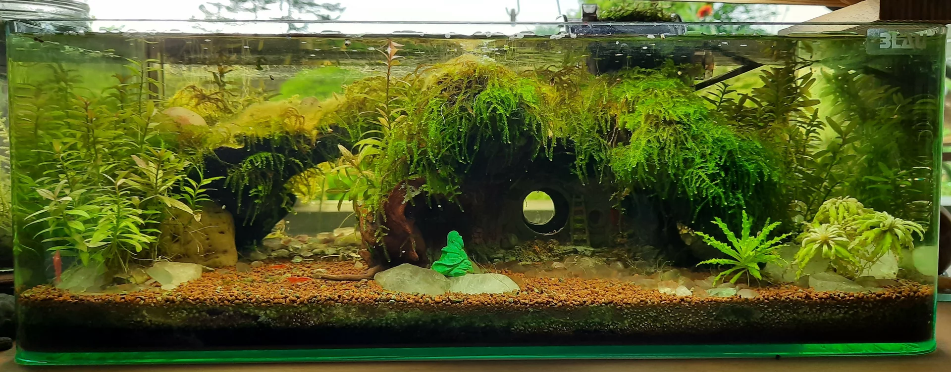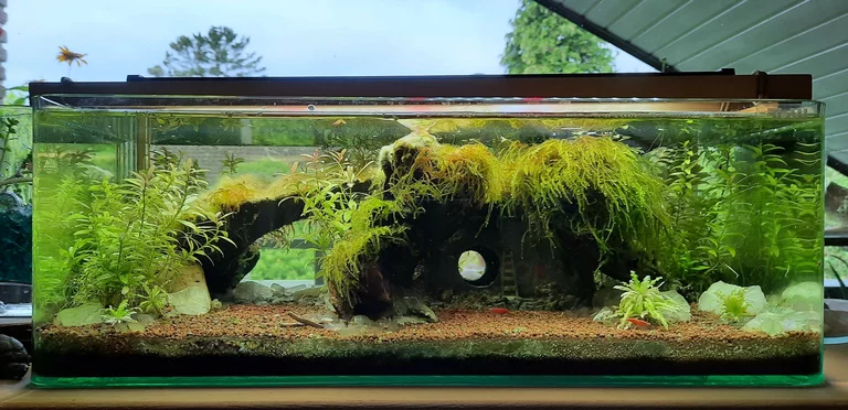 Zu den Teichbewohner:innen kamen nach einigen Monaten noch eine Rennschnecke (Neritina turrita) und ein paar Zwerggarnelen (Neocaridina davidi). Sie kommen gut mit Temperaturschwankungen zurecht (bei mir unterm Dach kann es ziemlich warm werden) und sind auch sonst genügsam.